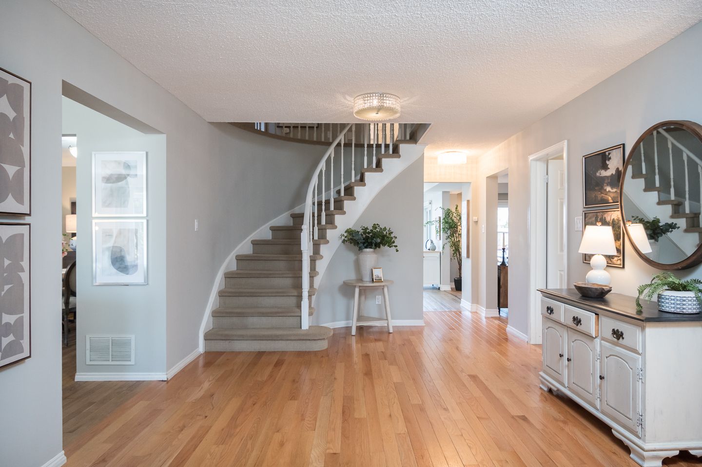 Upstairs are four large bedrooms, including a primary suite with a walk in closet and 4 piece ensuite, plus an updated 5 piece main bath. A convenient 2 piece powder room and main floor laundry with side yard access add to the home’s functionality.