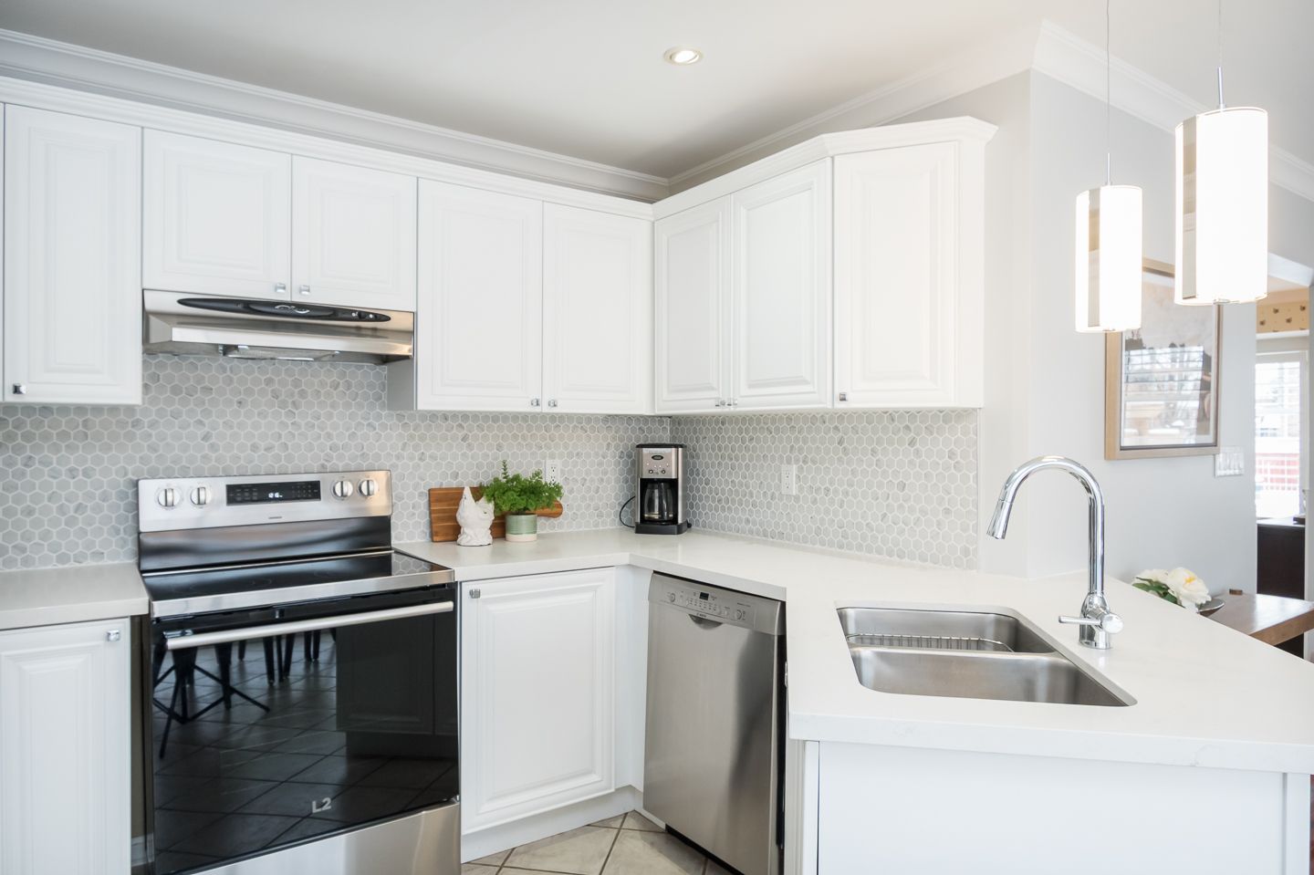 All white updated kitchen with stainless steel appliances