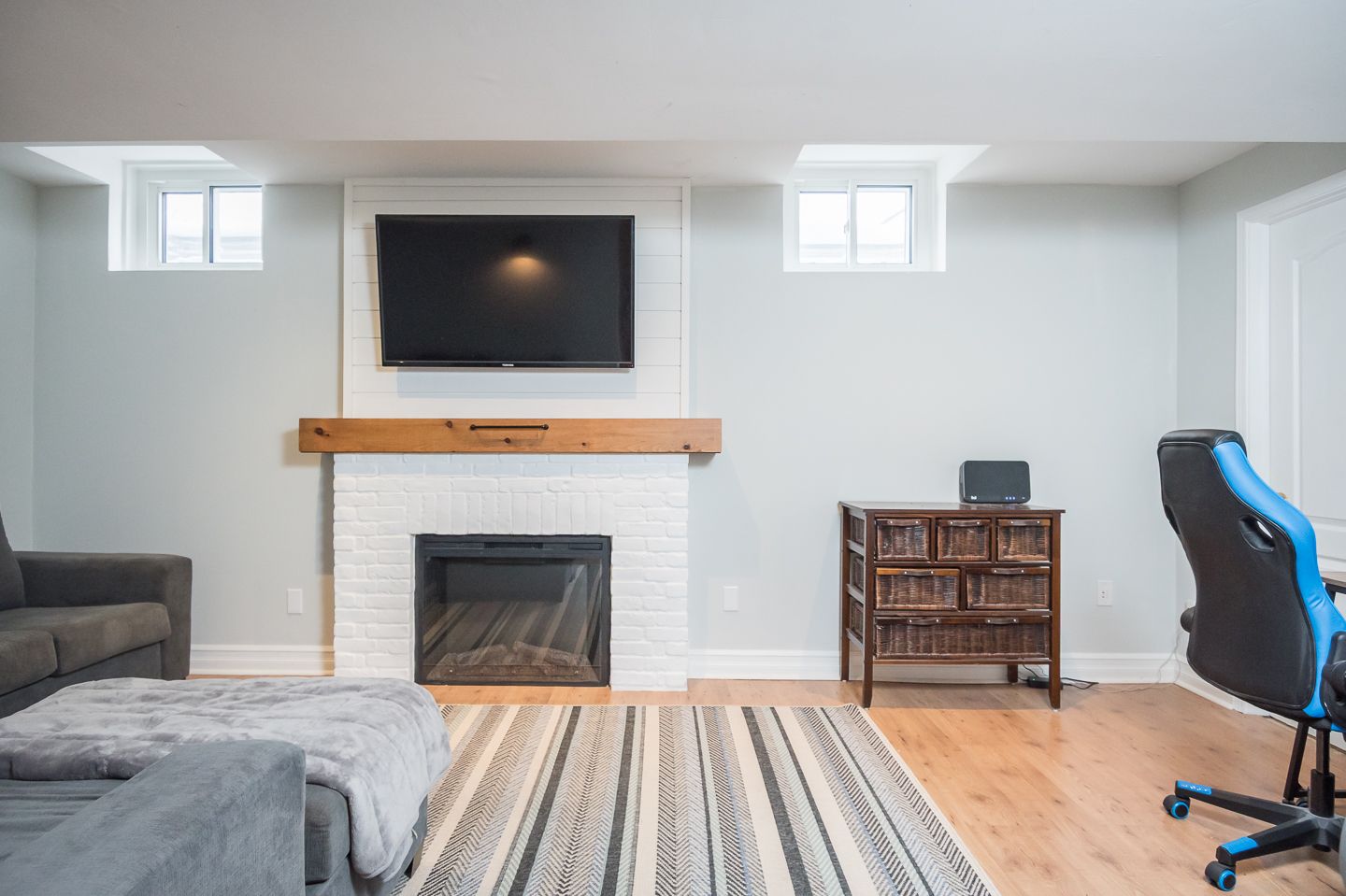 REC ROOM WITH COZY ELECTRIC FIREPLACE