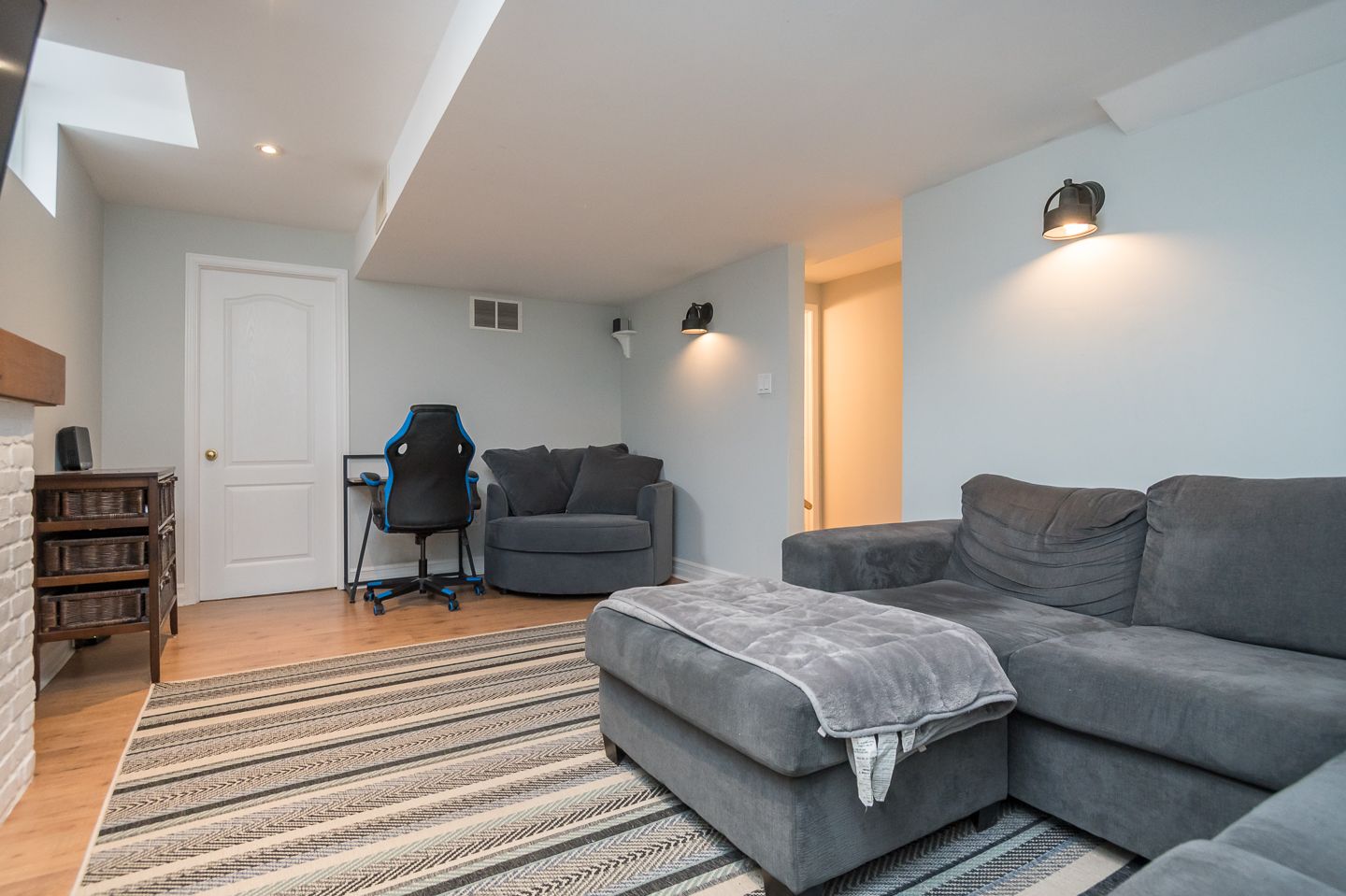 Interior garage door access conveniently positioned adjacent to finished basement