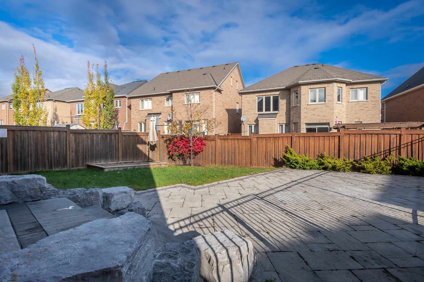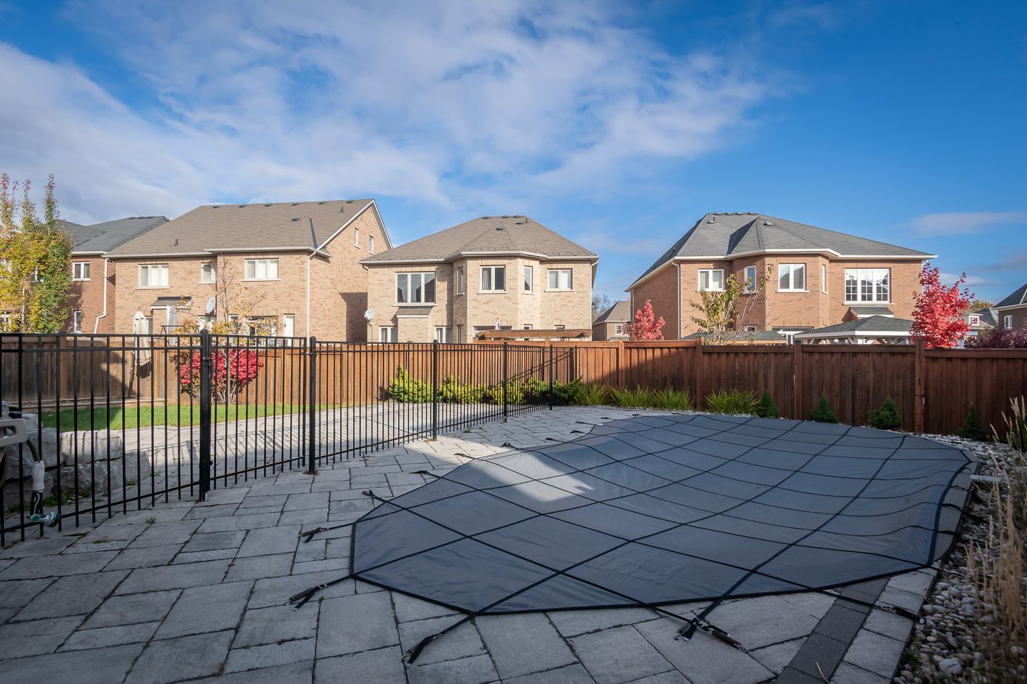 Fully fenced backyard with stunning hardscaping and salt water inground pool