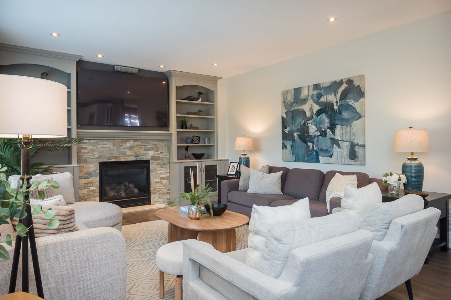 Open to kitchen family room with built-ins and fireplace with stone surround