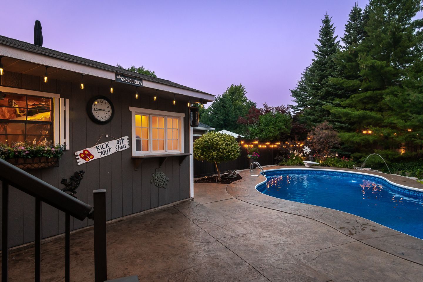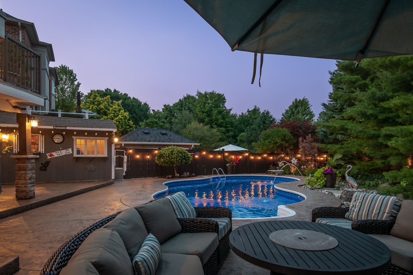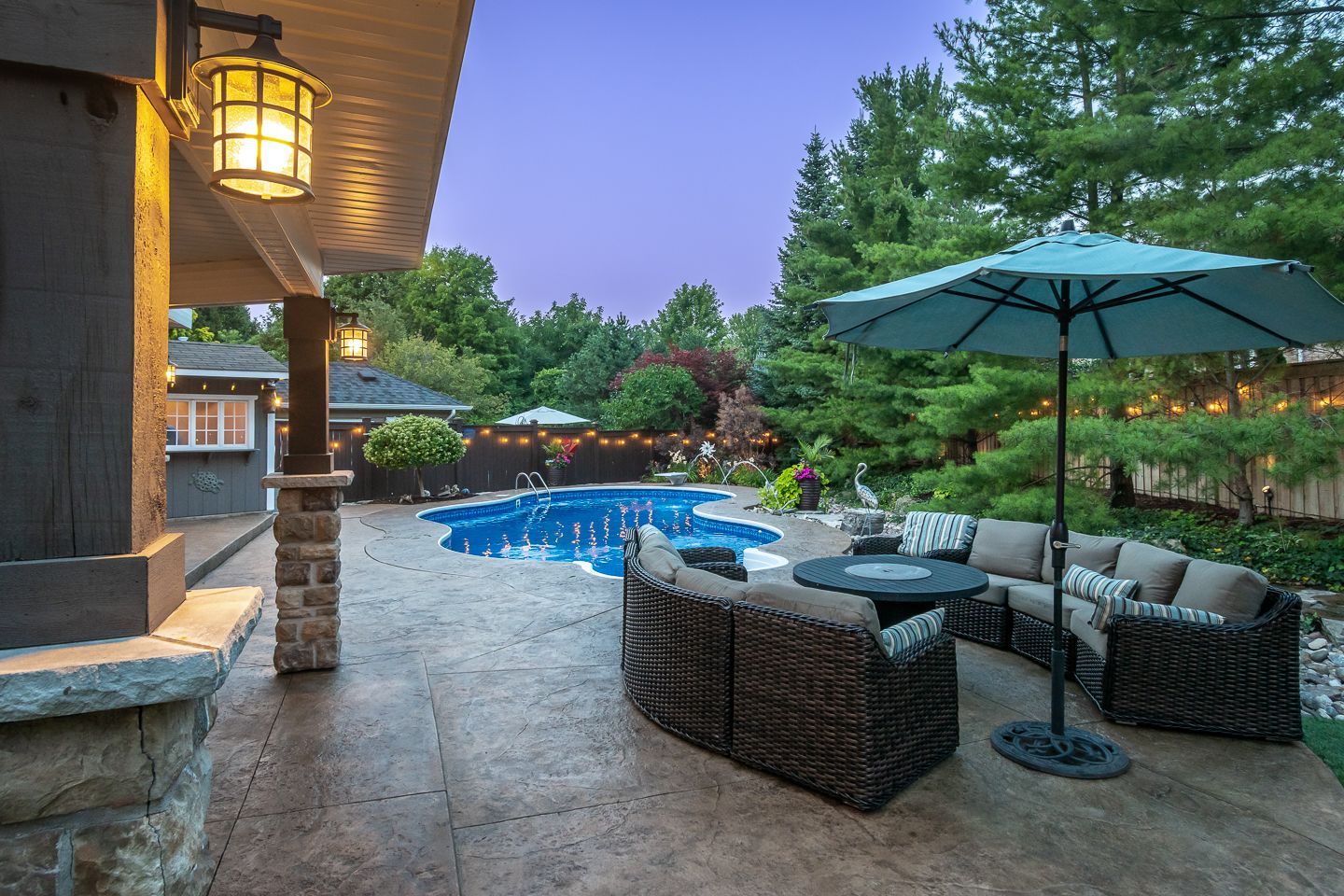 Stamped concrete pool deck, large gardens and shed with power