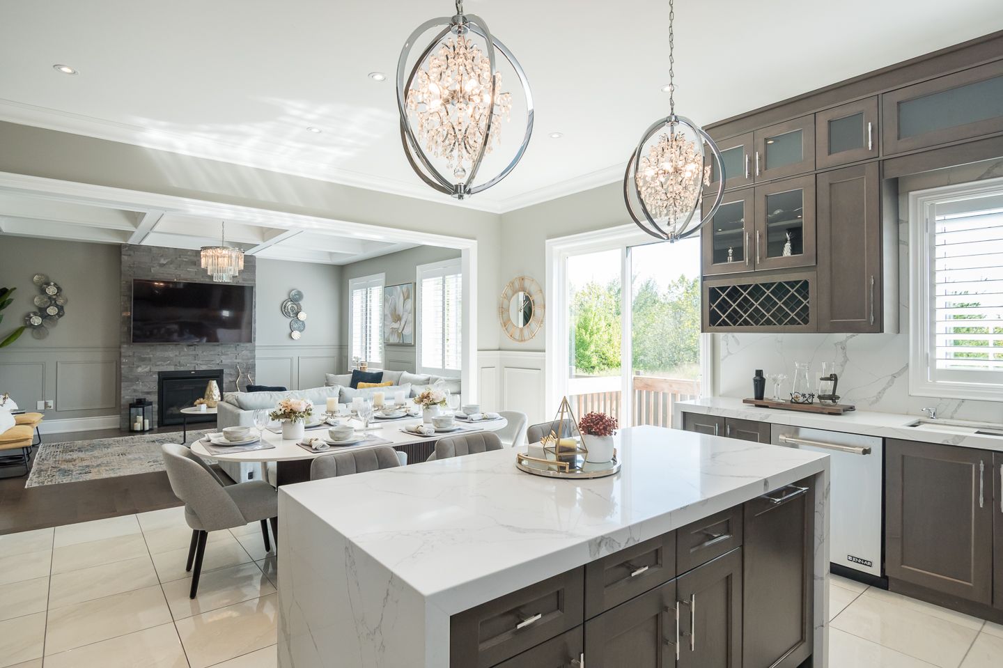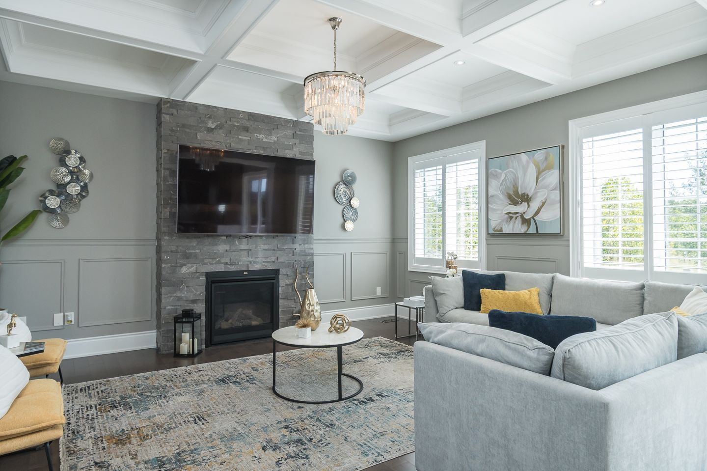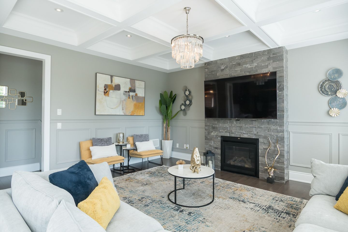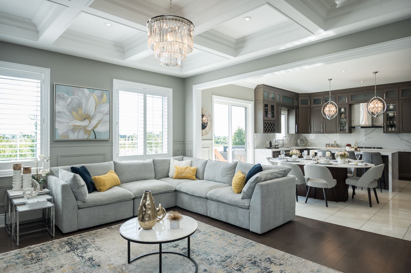 Coffered ceilings in dining and living rooms