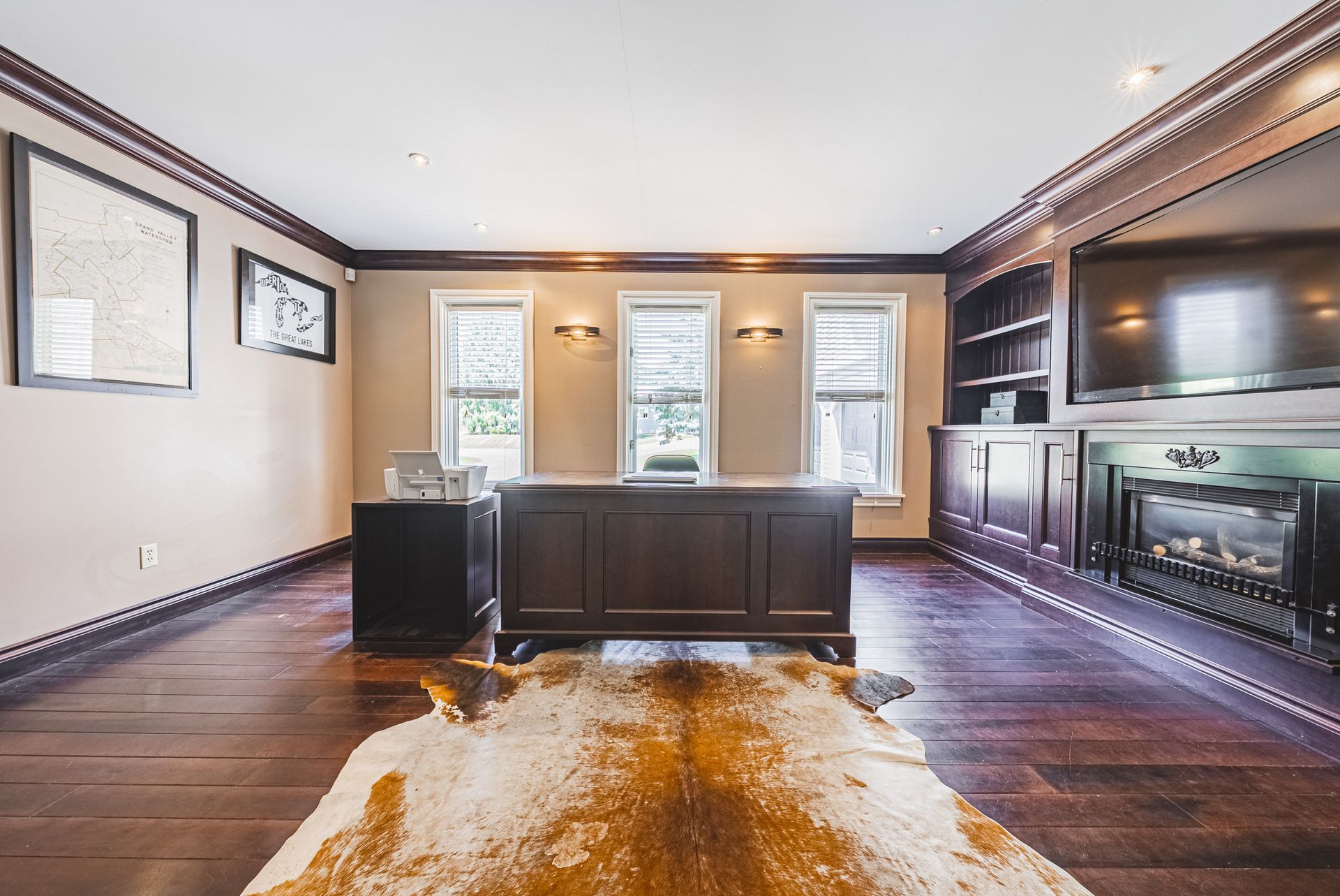 Step inside to a warm and welcoming home with a covered entrance, a large living room with fireplace and walkout to a private patio, and a dedicated office. The kitchen is spacious with modern appliances, ample prep space, and panoramic windows overlooking the pool. A walkout deck brings the outdoors in. A harvest style dining area and main level laundry complete the main floor.