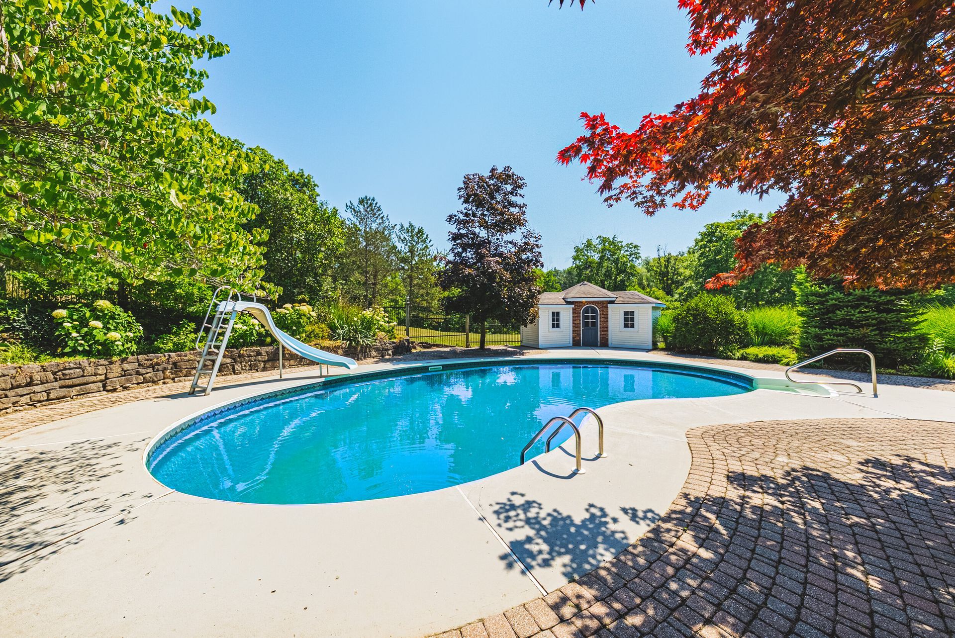 The finished walkout basement is built for gatherings. You will find a second kitchen, bar, bedroom, full bathroom, sauna, and direct access to the covered poolside area. The pool zone is designed for easy entertaining with a slide and a dedicated pool hut.