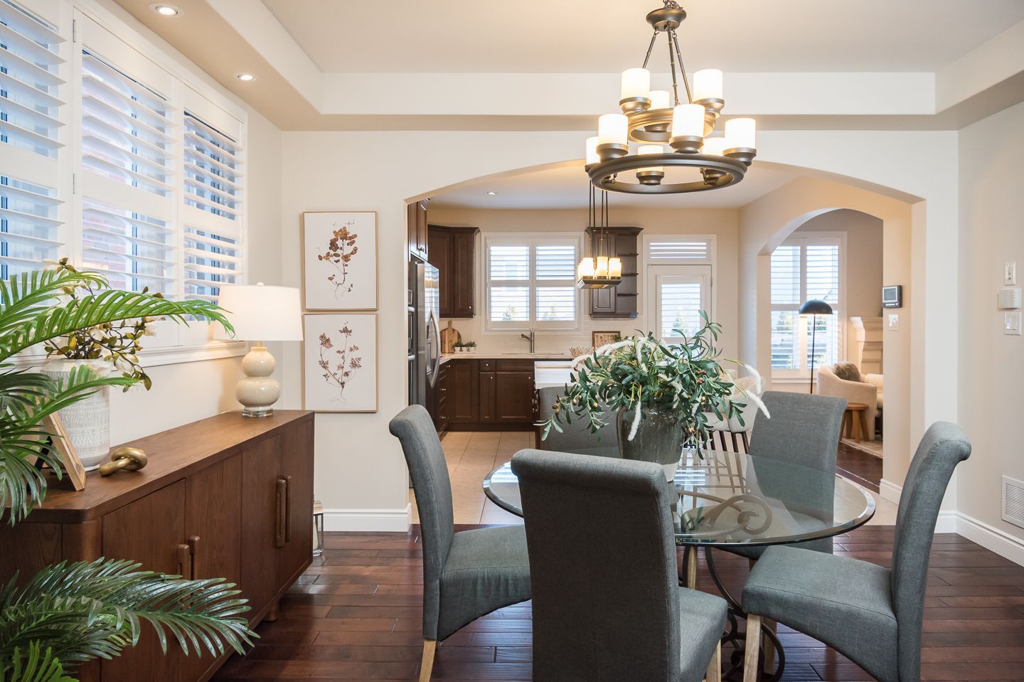 The main floor offers 9 foot ceilings, upgraded lighting, rich dark hardwood, and an exceptional layout with generous living spaces. This functional open concept floorplan features a cozy family room with a gas fireplace, a formal dining room, and a versatile flex room that’s perfect for a home office, playroom, or additional sitting area.