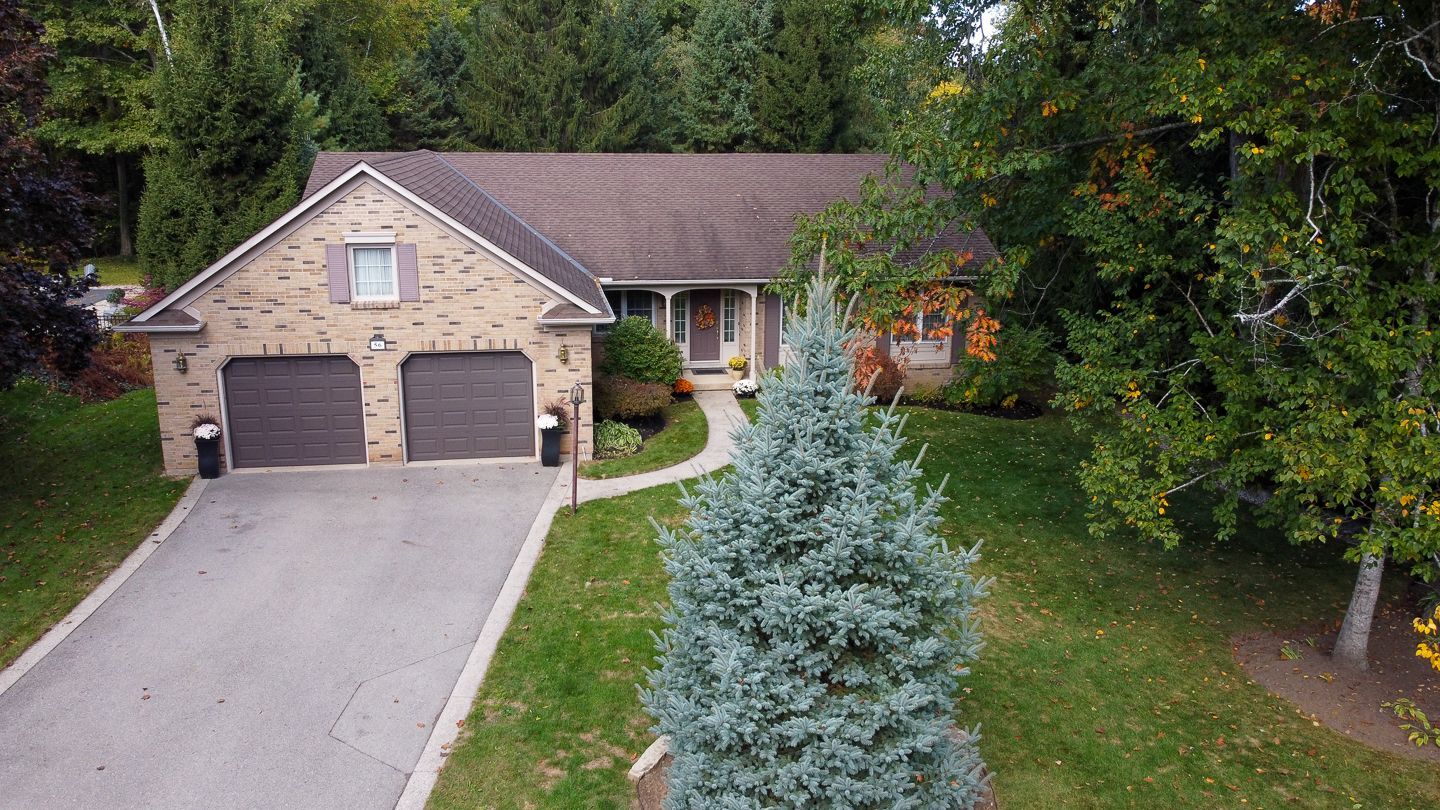 Country charm. Modern comfort. Room to breathe. Welcome to 56 Acredale Drive — a beautifully maintained Carlisle bungalow set on a rare half-acre lot, just steps to the library, community centre, amenities, and nearby golf courses. Enjoy small-town serenity without sacrificing everyday convenience. Offering over 2,000 sq ft of above-grade living space, this home is designed for both entertaining and easy living. A double garage and six-car driveway welcome guests, while main-floor laundry and interior garage access add everyday practicality. The bright eat-in kitchen features white cabinetry, granite counters, tile backsplash, and walkout to a two-tier deck with remote controlled retractable awning — the perfect place for summer evenings overlooking the expansive backyard complete with a relaxing hot tub. Inside, elegant millwork, hardwood flooring, crown mouldings, French doors, and oversized windows fill the home with warmth and natural light. Separate living and family rooms plus a formal dining room offer flexibility for families and gatherings alike. The primary retreat includes multiple closets and a private ensuite, while two additional bedrooms share a full bath. Downstairs, the fully finished basement extends the lifestyle: a spacious rec room with built-ins, two versatile bonus rooms (ideal for bedrooms, office, or gym), workshop, sauna, and a full bath with jacuzzi tub — perfect for guests or multi-generational living. Serviced by municipal community well and septic, and equipped with owned on-demand hot water heater, sump pump, and water softener — comfort and peace of mind come included. Space, privacy, and a true community setting — this is Carlisle living at its best.