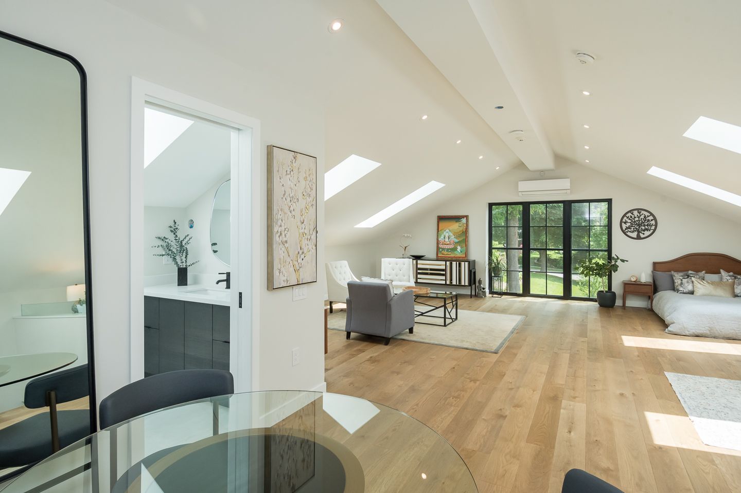 • The living room offers a quiet sense of grandeur. Northern Wide Plank hardwood runs throughout, grounding the space with warmth and continuity.