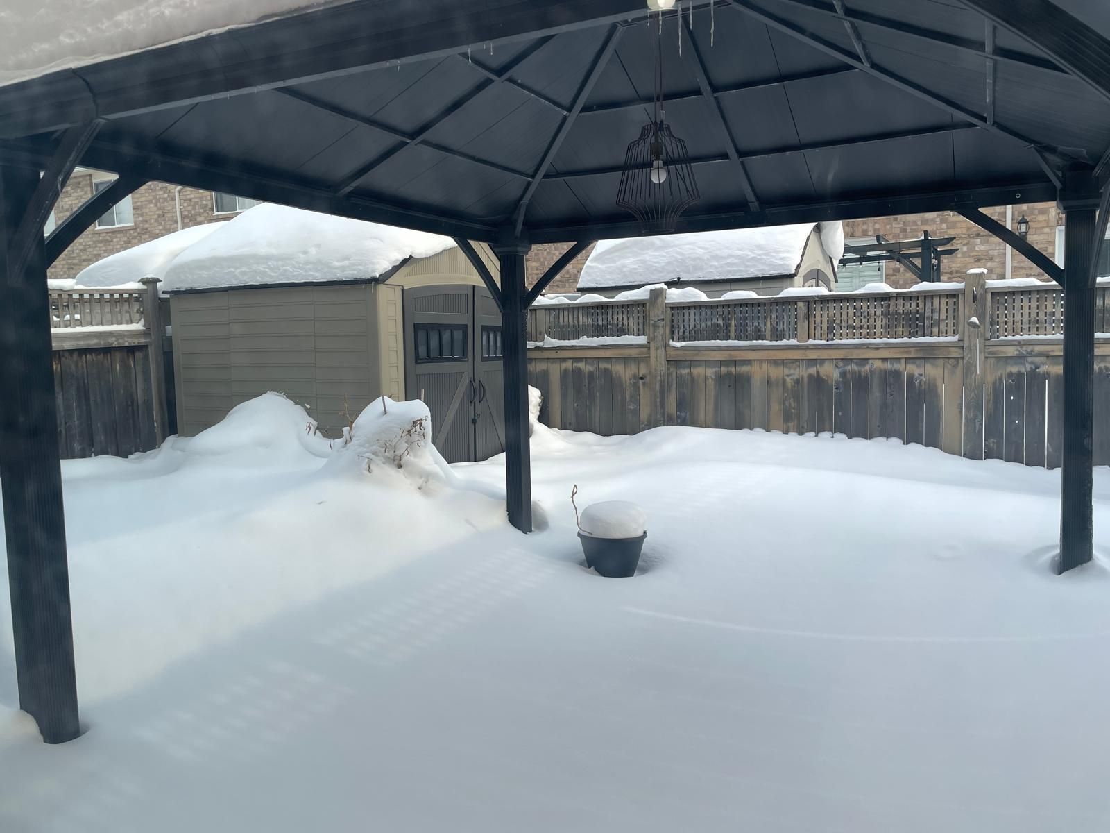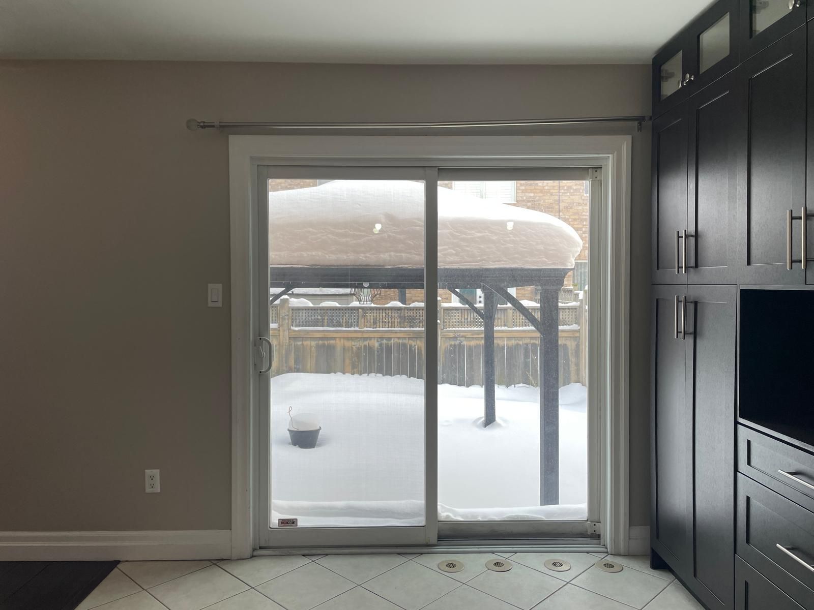 Fully fenced backyard with patio